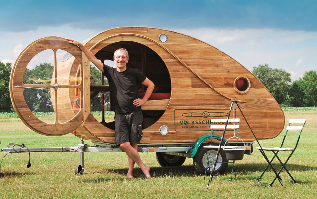Karavan kompletně ze dřeva a ještě vlastnoručně vyrobený – zní to jako utopie, ale Anno Mentzel z Oldenburgu dokázal, že to je možné. Vystudovaný technik konstrukce letadel pracoval řadu let u společnosti Airbus, podílel se na vývoji i na výzkumu. Po řadě let se ale podle jeho slov stal příznivcem „odvážného minimalizmu“ a ekologie. „Stále dál, výš a rychleji – to mne přestalo naplňovat,” podotkl Mentzel. Proto již 12 let pracuje v oldenburgském centru „Spolek pro komplexní poznávání a pro ekologickém otázky“. Tady se z něj stal jeden posledních stavitelů letadel ze dřeva na světě. Jako konstruktér letadel změnil své profesní názory a stal se odborníkem na lehká letadla, zároveň pracuje jako testovací pilot a učitel létání. Jeho vize zní: mobilita má být prováděna ekologičtěji, trvaleji a efektivněji. Proto založil společnost VolksSchrauber, v níž vyvíjí a vyrábí ekologická lehká letadla a nyní také obytné vozy.