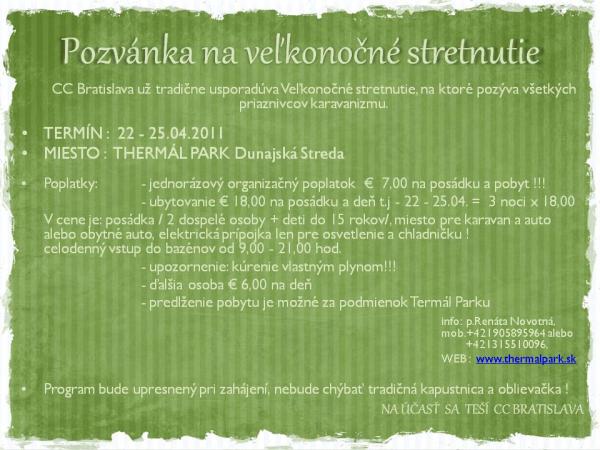 Caravan club Bratislava zve všechny příznivce karavaninku na tradiční setkání, které se uskuteční v termínu 22. – 25. dubna v Thermál Parku Dunajská Streda. Program se teprve upřesňuje, už teď ale mohou zájemci počítat s tradiční kapustnicí (zelnou polévkou) a velikonoční pomlázkou. Poplatky za sraz obnáší jednorázový příspěvek 7 € + dalších 18 € za každou posádku (2 dospělí a děti do 15 let) a den, za tři noci tedy celkem 61 €. Další osoba navíc platí 6 €/noc. V ceně je elektrická přípojka a celodenní vstup do bazénů (9-21 hod), topit je nutné vlastním plynem.